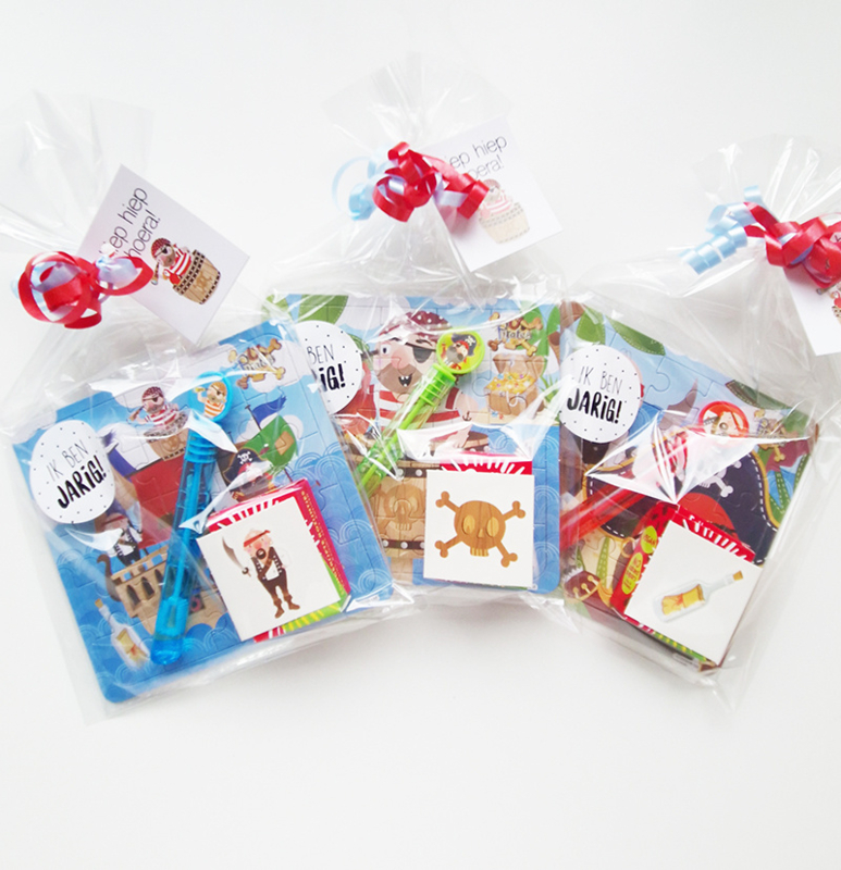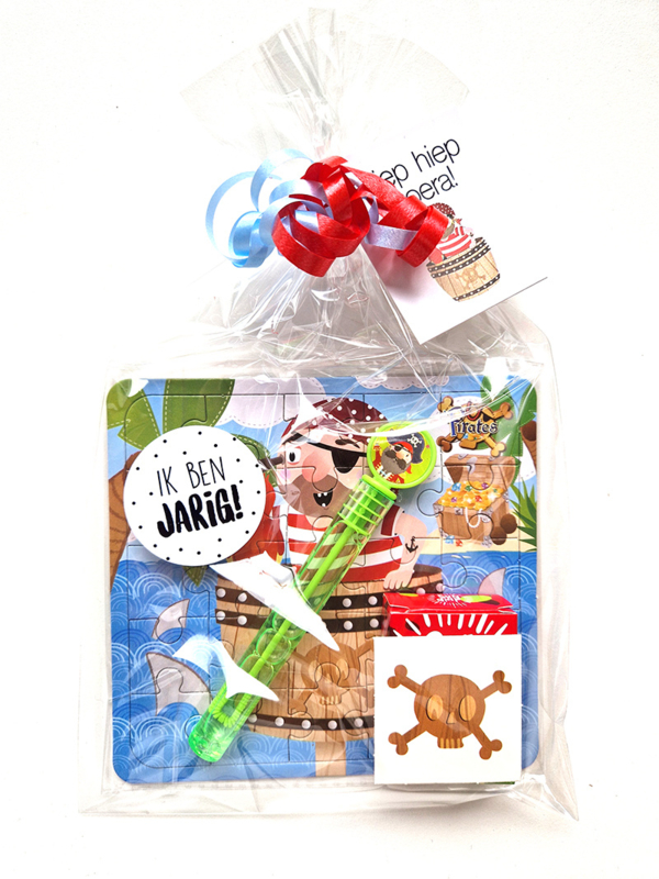 Piraat Ahoy! Ik ga trakteren in de klas! Deze piraten traktatie is erg leuk om uit te delen, want er zitten 3 verschillende piraten uitdeelcadeautjes in! Een legpuzzeltje, een bellenblaasje en fraaie piraten tattoo!